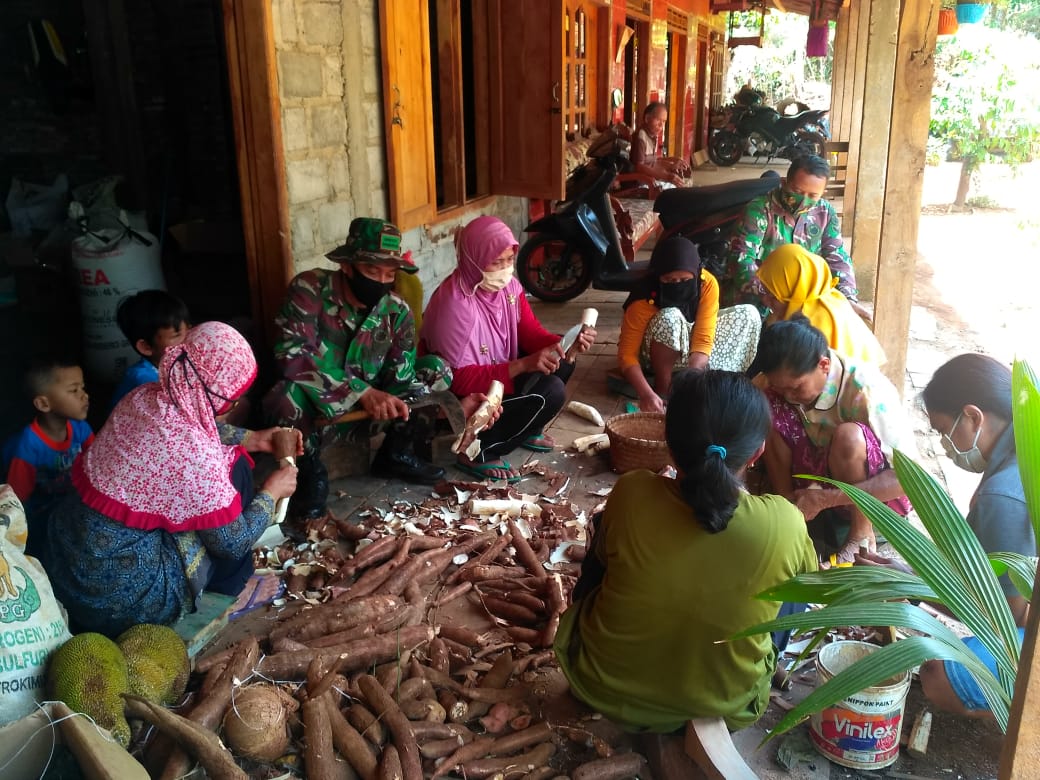 Sambil mengupas kulit singkong anggota Satgas TMMD Reguler Ke-109 Kodim 0727/Karanganyar Sertu Heriyadi dan Sertu Budi Cahyono membantu ibu-ibu yang sedang membersikan dan mengupas singkong untuk di jadikan tape. Sambil ngobrol, keakraban ini ajang untuk bertukar pengalaman dan berbagi informasi selama kegiatan TMMD berjalan.