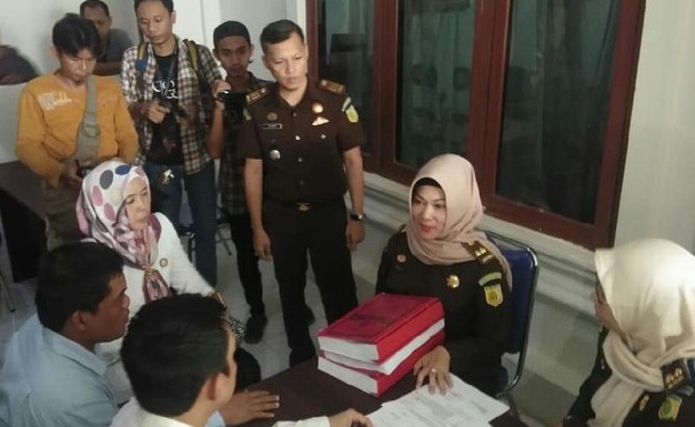 Pelimpahan berkas dilakukan oleh jaksa penuntut umum Kejari Palembang, Indah Kumala Dewi dan Ursula Dewi. Tampak keduanya membawa satu berkas perkara kelima komisioner.