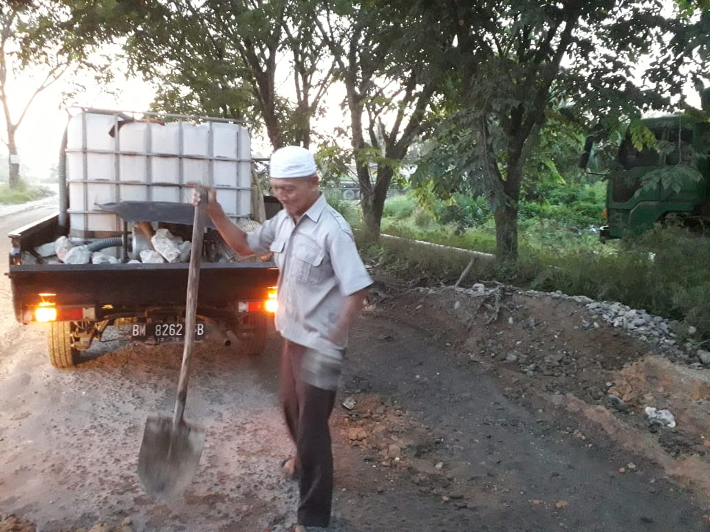 Dia datang sendiri kelokasi jalan raya di depan Polsek Tapung ini dengan membawa mobil pick up miliknya, beserta material dan peralatan berupa cangkul untuk menimbun lobang besar ditengah jalan.