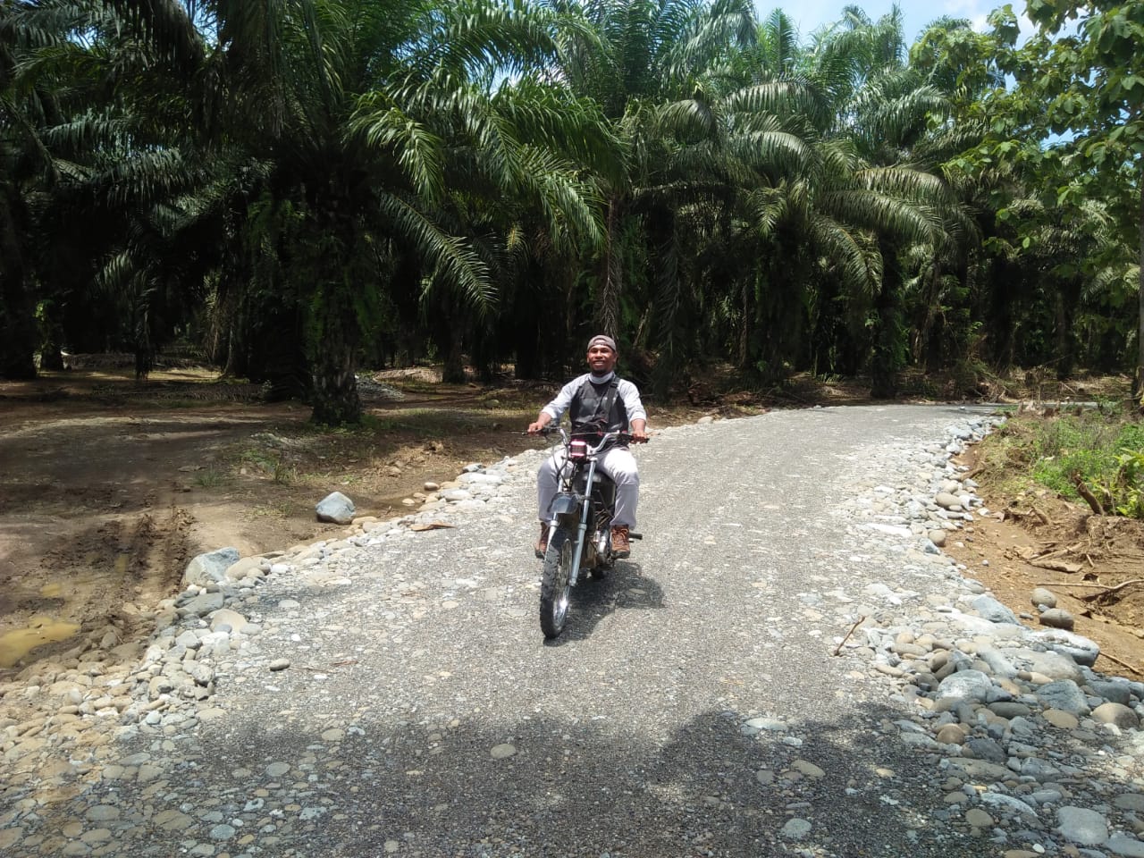 BANGGAI.Warga Dusun I, Desa Samalore, Kecamatan Toili, Mahmud (35), tersenyum lebar saat melintasi jalan Desa, yang dikerjakan oleh Anggota Satgas Tentara Manunggal Membangun Desa (TMMD), ke-107, Tahun 2020, Kodim 1308/Luwuk Banggai, di Desa Samalore, Kecamatan Toili, dan Desa Argakencana, Kecamatan Moilong, Kabupaten Banggai, Sulawesi Tengah.