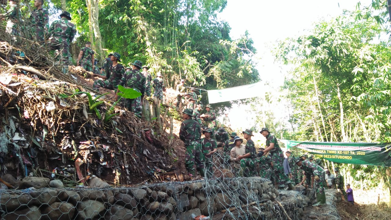 NewsHanter.Com,Situbondo – Jumat (20/03/20)  Agar tidak terganggu hujan, pekerjaan Pembuatan Bronjong di kebut dari  pagi pimpinan Lettu  inf Pranoto. Sebagai Danton 1 TMMD dan juga Danton 2 Letda  Inf Kasiadi dan Danton 3 Letda Inf Prayitno, dari pagi mengerahkan  anggotanya.
