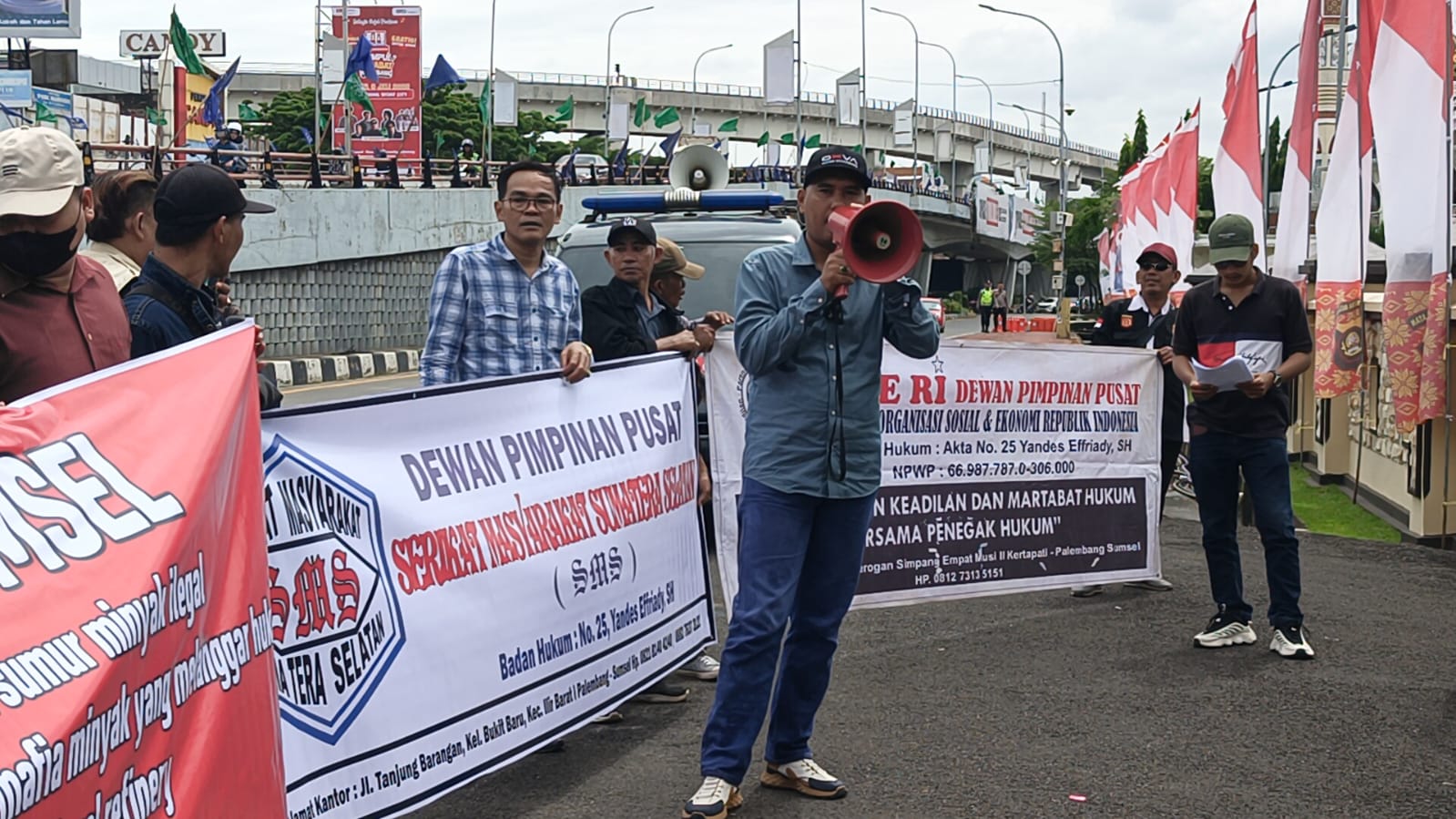 Palembang, newshanter.com – Puluhan massa yang tergabung dalam Serikat Masyarakat Sumatera Selatan (SMS), POSE RI, dan media jo partner menggelar aksi damai di halaman Mapolda Sumsel, Senin (7/7/2025).