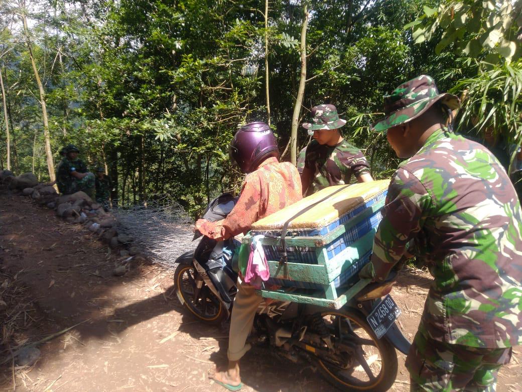 NewsHanter.Com,Situbondo – Anggota Satgas TMMD 107 Kodim 0823 Situbondo di sela sela kegiatan pemasangan Bronjong membantu pedagang ikan keliling yang melintasi jalan baru dibangun. Bpk Sukrib, pedagang Ikan keliling asal dsn Pesisir Besuki. Jumat (20/03/20)