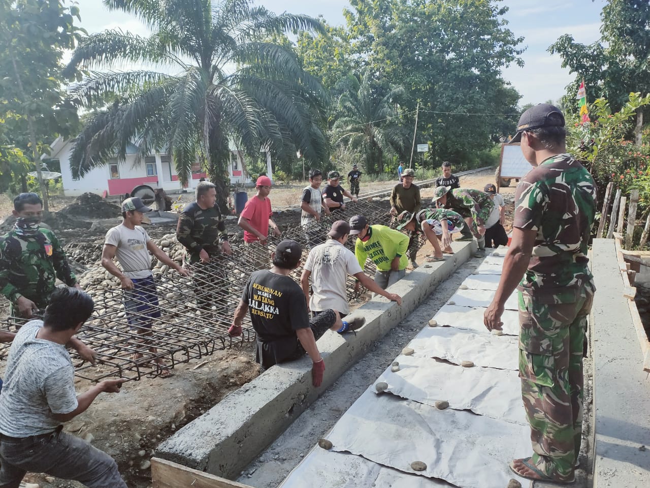 Banggai,-Pembangunan pembuatan plat deker yang dikerjakan Anggota Satgas TMMD di Desa Samalore Kecamatan Toili kembali dilanjutkan pengerjaanya. Hal itu terlihat pada Jumat (20/3) dimana anggota kembali melakukan penganyaman besi dan dilanjutkan dengan pengecoran.