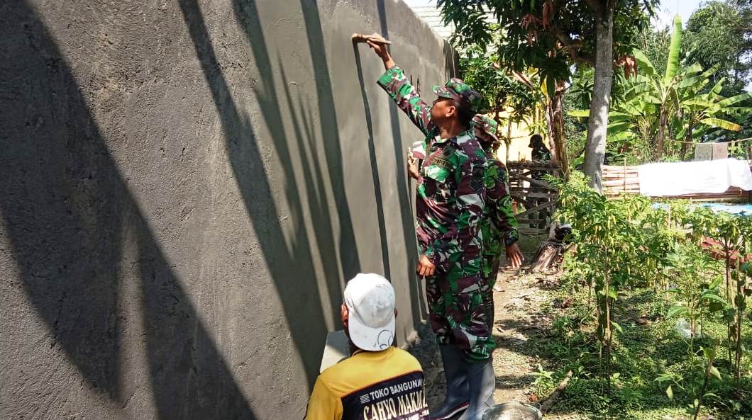 Saat merehab rumah Manis, di Dukuh Pepedan, RT 02/RW 07, Prada Susanto belajar dengan praktek langsung bagaimana memplester tembok sekaligus mengacinya. ”Sungguh kesempatan yang langka bisa mendapatkan guru tukang batu dan gratis. bahkan tidak hanya itu, saat belajar langsung praktek langsung di lapangan,” terang Prada Susanto. (rus)