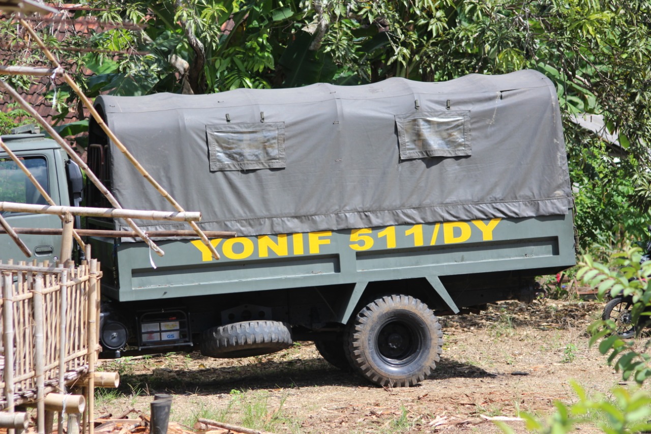 Tulungagung,- Mobil Pasukan yang biasa untuk mengangkut anggota TNI Yonif 511/DY terparkir di halaman rumah warga. Tak terbiasa mobil ini berada di Desa Ngepoh Kecamatan Tanggunggunung, Kabupaten Tulungagung.
