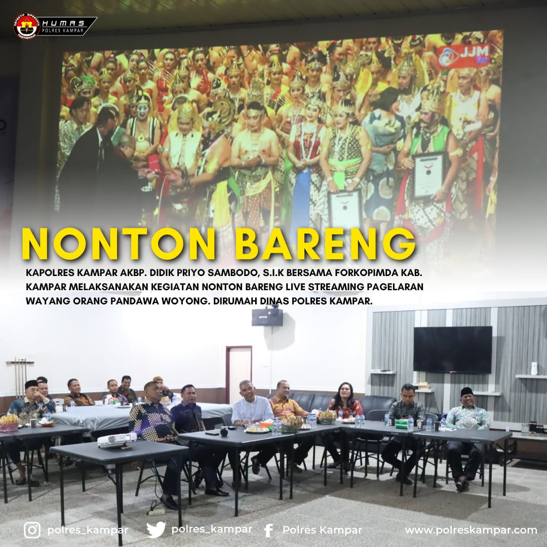 Dalamkesempatan ini Kapolres Kampar beserta PJU Polres Kampar mengajak Forkopimda mengikuti dan menyaksikan pagelaran Wayang Orang yang di perankan langsung oleh Bapak Kapolri Listyo Sigit Prabowo yang menceritakan tentang kisah Pandawa Lima, dengan mengikuti nonton bareng (nobar) secara live.