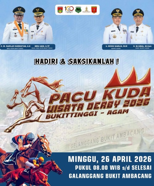 Bukittinggi, newshanter.com – Pemerintah Kota Bukittinggi bersama Pemerintah Kabupaten Agam Regency kembali menggelar ajang pacu kuda bertajuk Wisata Derby 2026 Bukittinggi–Agam. Kegiatan ini dipastikan gratis, baik bagi penonton maupun peserta, sebagai upaya meningkatkan minat dan partisipasi masyarakat.