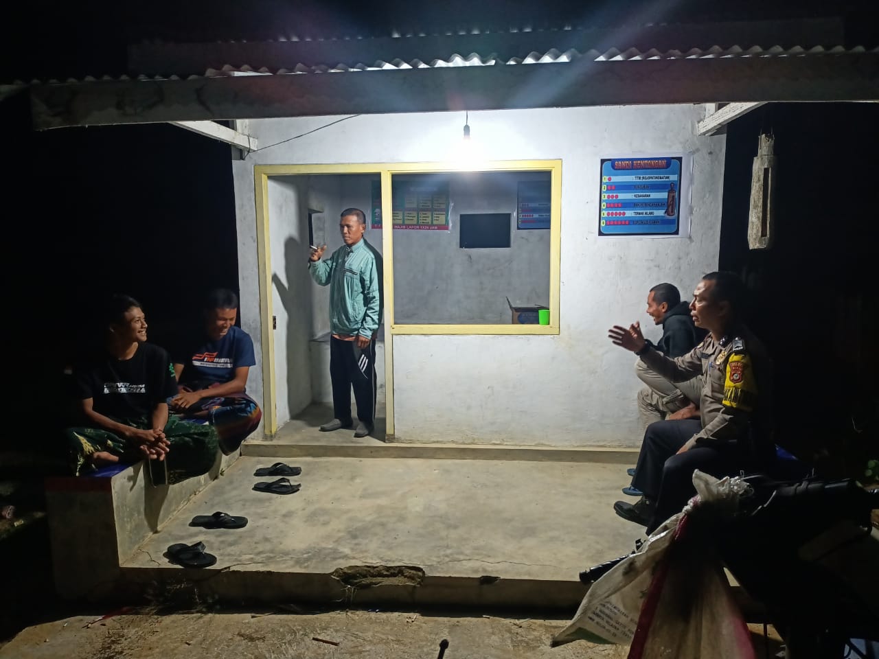 Dalam sambangnya, Bhabinkamtibmas melaksanakan Dialog dengan petugas ronda sekaligus menyampaikan pesan kamtibmas agar Meningkatkan kewaspadaan terhadap para pelaku kejahatan.