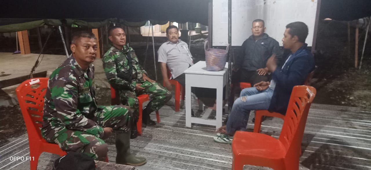 BANGGAI— Perwira Seksi Teritorial (Pasiter) Kodim 1308 Luwuk Banggai Kapten Inf Ardiansyah bersama Babinsa Sertu Miden Abas, Kasubsektor Moilong Ipda Iksanudin dan Kepala Seksi (Kasi) Pemerintahan Kecamatan Moilong Zet Saloko berjaga-jaga di posko pencegahan dini virus corona COVID-19, Kamis (9/4/2020) malam.