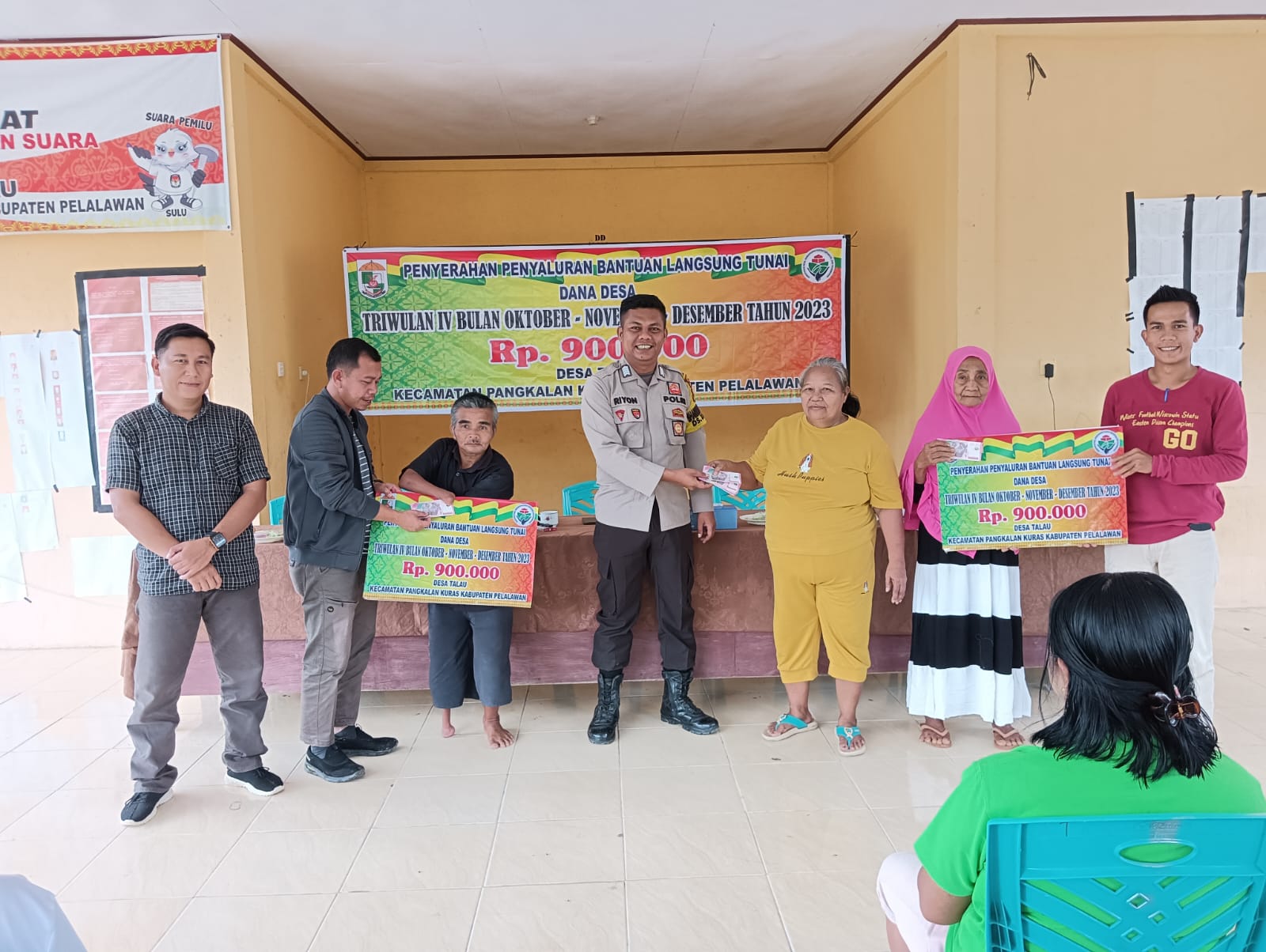 PELALAWAN, NEWSHANTER.COM – Untuk memastikan kondisi aman dan kondusif, Polsek Pangkalan Kuras jajaran Polres Pelalawan Polda Riau hadiri penyerahan Bantuan Tunai Langsung Dana Desa (BLT-DD) di Desa Talau Kecamatan Pangkalan Kuras Kabupaten Pelalawan, Sabtu (23/12/2023). Penyerahan BLT-DD untuk Triwulan IV Tahun 2023 periode Bulan Oktober sampai Desember.
