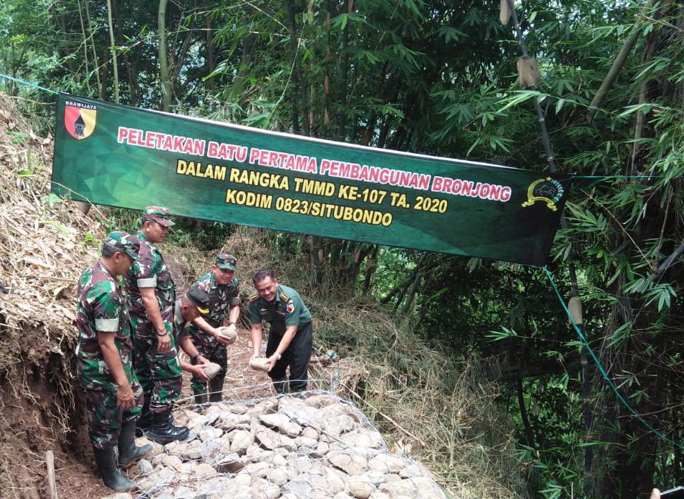 Newshanter.com, Situbondo –Mewakili Pangdam V/Brw, Staf Ahli bidang Komsos Pangdam V/Brw Kolonel Arm Suwanto didampingi Dandim 0823/Situbondo Letkol Inf Ahmad Juni Toa meletakan batu pertama tanda dimulainya pengerjaan sasaran pembuatan bronjong jembatan yang menghubungkan dua desa Tlogosari dan desa Alas Tengah, Kecamatan Sumber Malang, Kabupaten Situbondo, Senin (16/3/20).