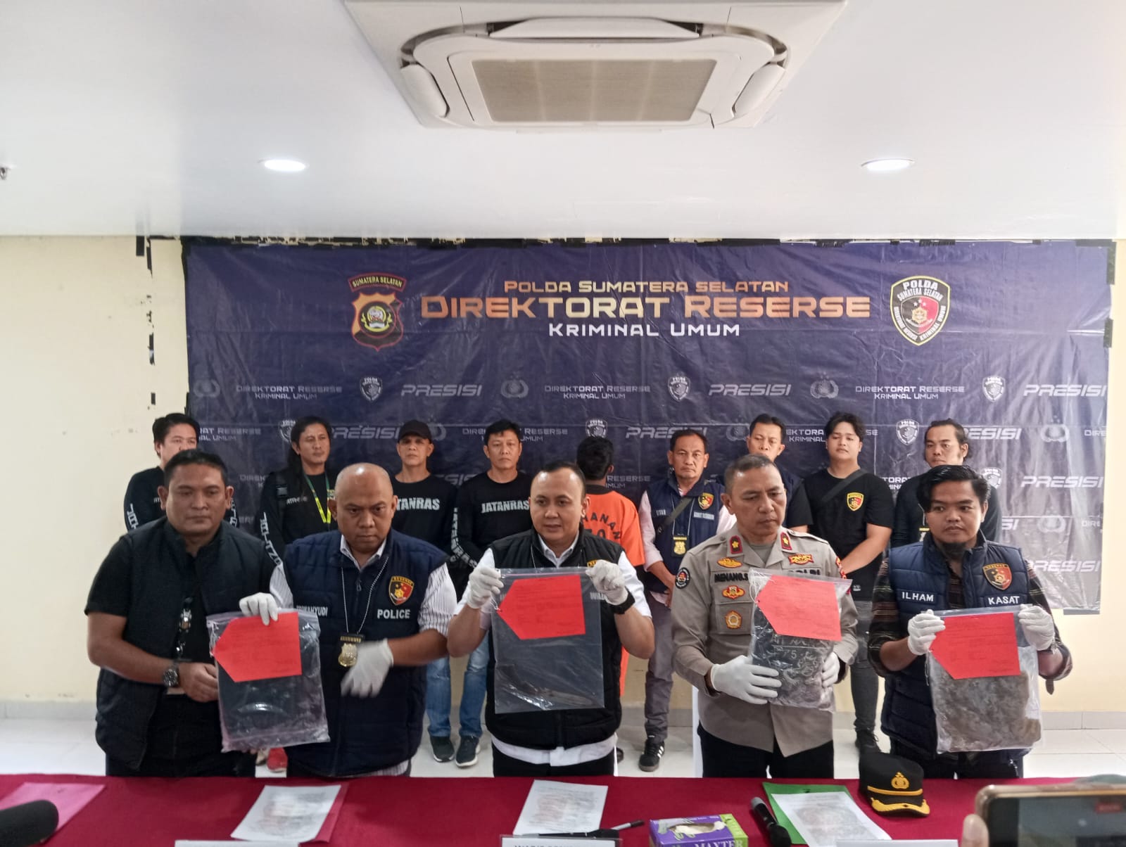 ” Satu tersangka sudah kita tangkap di kontrakannya, merupakan pelaku utama dalam tindak pidana tersebut,”ucap Wakil Direktur Ditreskrimum Polda Sumsel AKBP Indra Arya Yudha SIK didampingi Plt Kasubbid Penmas Bidhumas Polda Sumsel Kompol Menang,SH Kasubdit Jatanras AKBP Tri Wahyudi SH dan Kasat Reskrim Polres Ogan Ilir AKP M Ilham SIK saat jumpa pers, Selasa (08/10/2024).