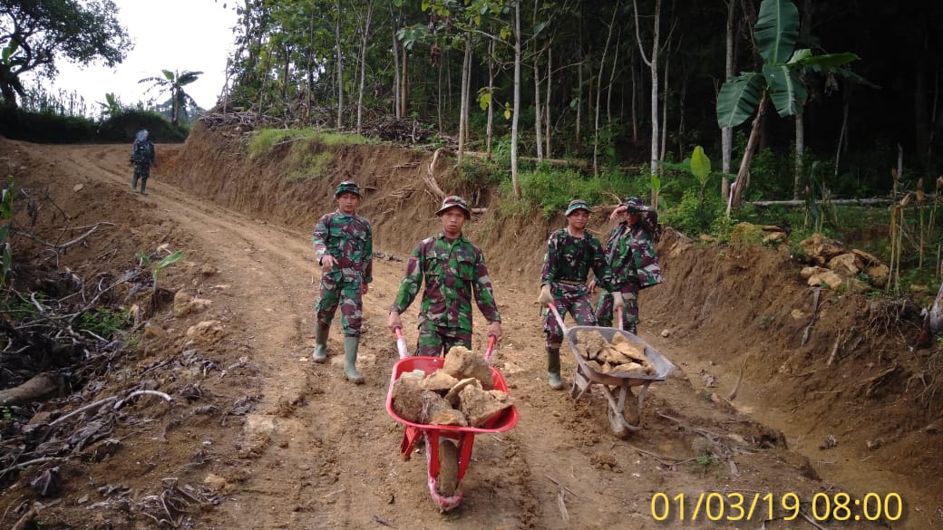 Sebagai bagian dari upaya memetaskan desa tertinggal sejumlah warga masyarakat dan anggota satgas TMMD bahu membahu terus melangsir matrial batu “pekerjaan membangun jalan makadam sepanjang 1.360 meter dengan kelebaran 2,5 meter membutuhkan matrial batu yang sangat banyak dan penempatan penumpukan matrial batu yang lumayan jauh sehingga kita harus melangsir ke lokasi penataan jalan makadam.”ungkap lettu inf Sudiono Danki SSK satgas TMMD reguler 104.