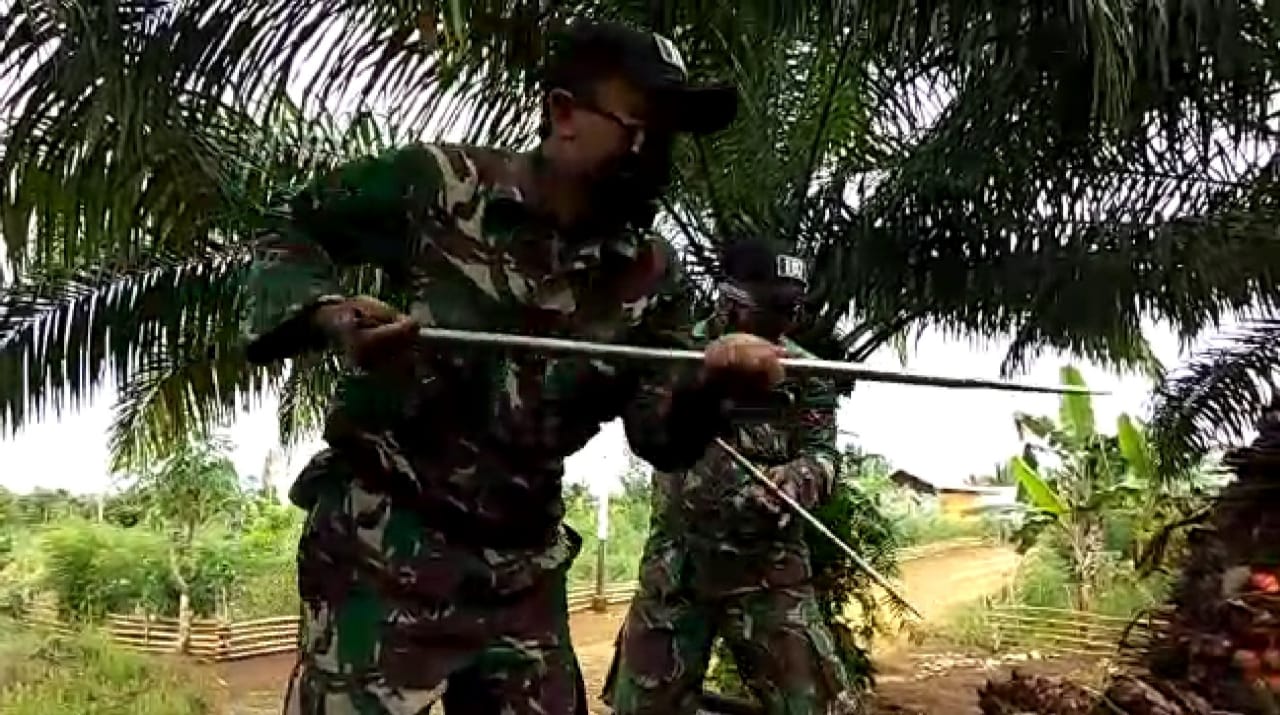Pelda Hendro yang merupakan salah satu anggota satgas TMMD ikut serta membantu panen plasma Sawit milik Suyat di Desa Samalore Kecamatan Toili.
