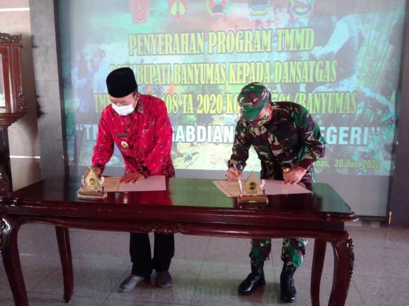 Banyumas – Bupati Banyumas, Ir. Achmad Husein, secara resmi menyerahkan pembangunan infrastruktur dan non fisik Desa Petahunan, Kecamatan Pekuncen, secara teknis kepada Dansatgas TMMD Reguler 108 atau Dandim 0701 Banyumas, Letkol Infanteri Candra, SE, M.I.Pol, melalui penandatangan naskah TMMD di Pendopo Sipanji, Banyumas. Selasa (30/6/2020).