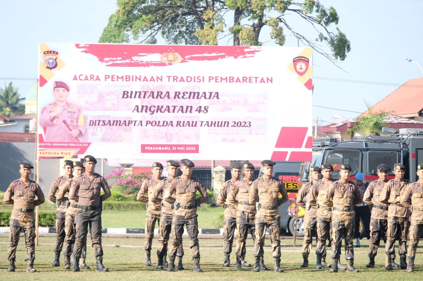 Pekanbaru,newshanter.com – Kepala Kepolisian Daerah (Kapolda) Riau, Inspektur Jendral Mohammad Iqbal memimpin upacara Tradisi Pembaretan Bintara Remaja Angkatan 48 di halaman depan Mapolda Riau, Rabu, 31 Mei 2023.