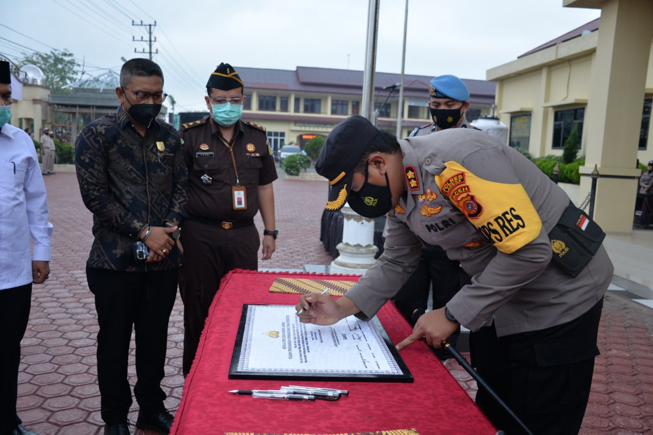 Setelah dilakukan pembacaan Deklarasi seluruh unsure Forkopimda menandatangani Piagam pencanangan Pembangunan Zona Integritas.