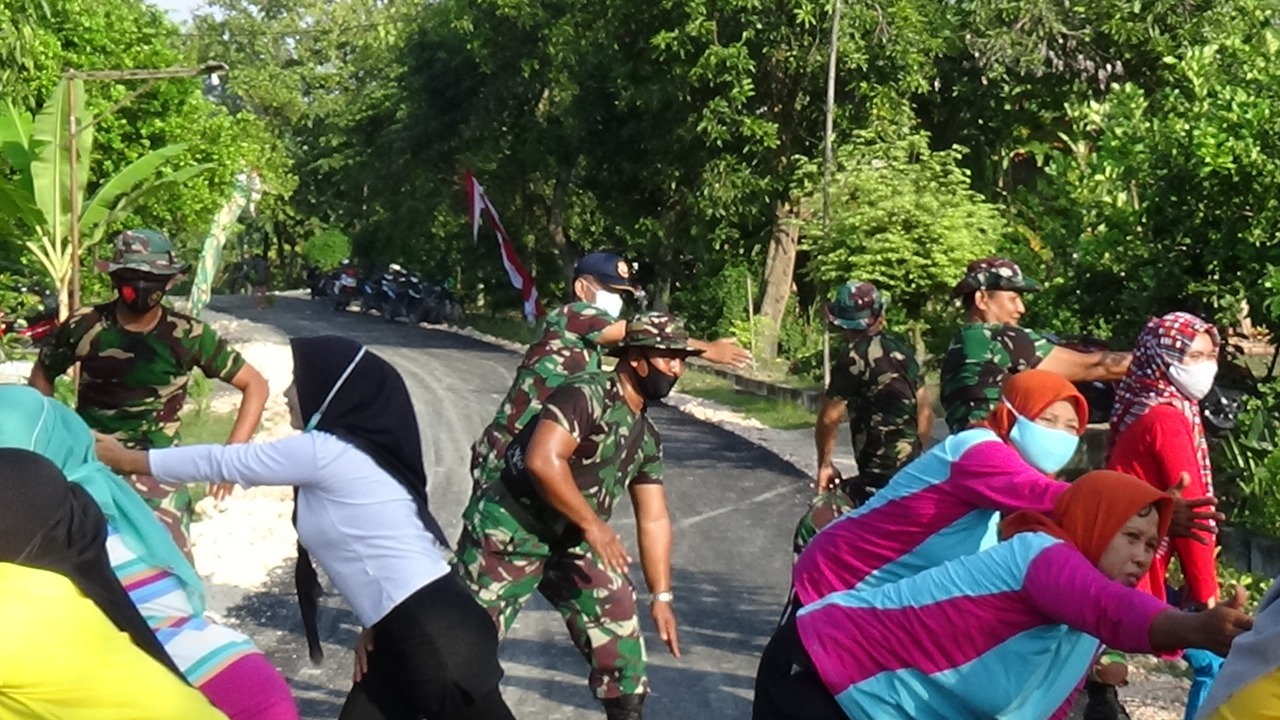 Dengan senam pagi di jalan aspal, Koptu Darminto bersama sejumlah ibu-ibu, meluapkan perasaan bangga dan ceria, Minggu (28/3/2021).