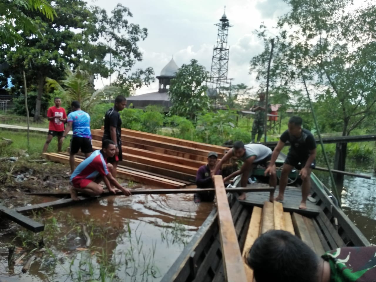 Kapuas,- satu persattu balokan kayu diturunkan dari perahu untuk diturunkan dibawa kelokasi pembuatan jembatan. Balokan Kayu yang diangkut diturunkan oleh TNI dan Warga secara gotong royong.