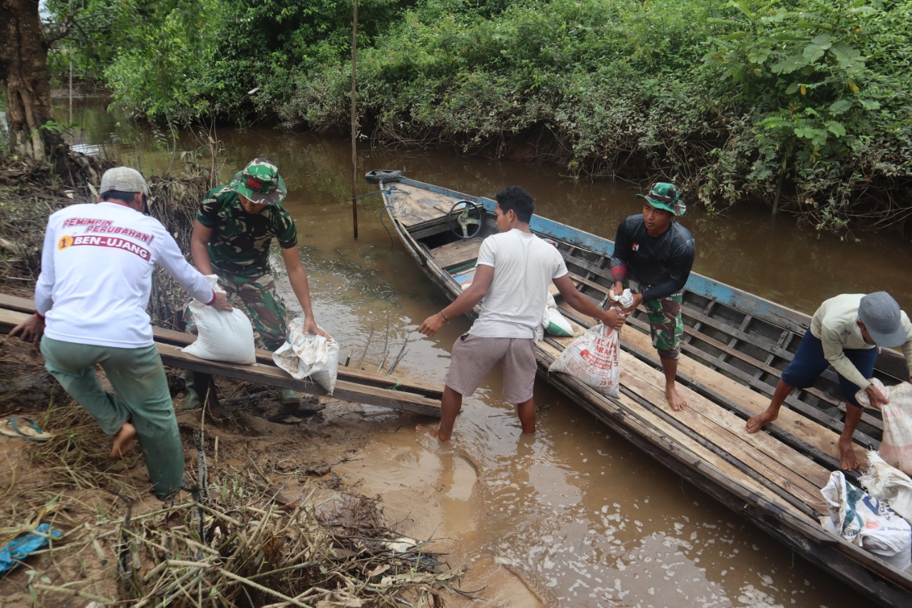 Kapuas,- Pengerjaan Sasaran fisik Program TNI Manunggal Membangun Desa (TMMD) Reguler ke -110, Kodim 1011/KLK di Desa Saka Lagun, Kecamatan Pulau Petak, Kabupaten Kapuas, terus dimaksimalkan. Anggota satgas TMMD bersama warga, bahu membahu mengumpulkan material pasir yang selanjutnya dibawa menuju pembangunan JUT dengan perahu kayu, Sabtu (20/3/2021).