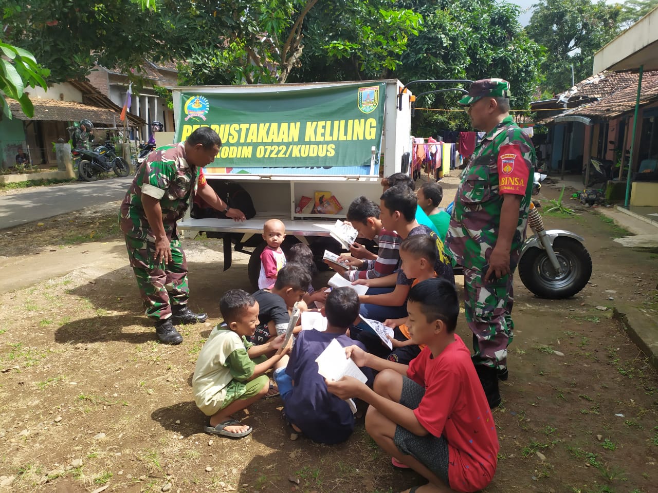 Kudus–Berbagai cara kreatif dilakukan oleh Satgas TNI Manunggal Membangun Desa (TMMD) Reg-107 Kodim Kudus salah satu kegiatan bersifat non fisik di Desa Kedungsari Kecamatan Gebog yaitu untuk menumbuhkan minat baca dan gemar membaca di kalangan anak-anak, beberapa Anggota Satgas TMMD menggunakan motor box dijadikan Perpustakaan Keliling.Kamis19/3/2020.