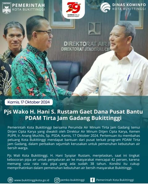 Bukittinggi, newhanter.com – Pemerintah Kota Bukittinggi bersama Perumda Air Minum Tirta Jam Gadang temui Dirjen Cipta Karya yang diwakili oleh Direktur Air Minum Ditjen Cipta Karya, Kemen PUPR, Ir. Anang Muchlis, Sp. PSDA, Kamis (17/10/2024).