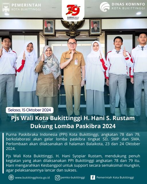 Bukittinggi, newshanter.com – Purna Paskibraka Indonesia (PPI) Kota Bukittinggi, angkatan 78 dan 79, berkolaborasi akan gelar lomba paskibra tingkat SD, SMP dan SMA. Yang akan di laksanakan di halaman Balaikota, 23 dan 24 Oktober 2024 mendatang.
