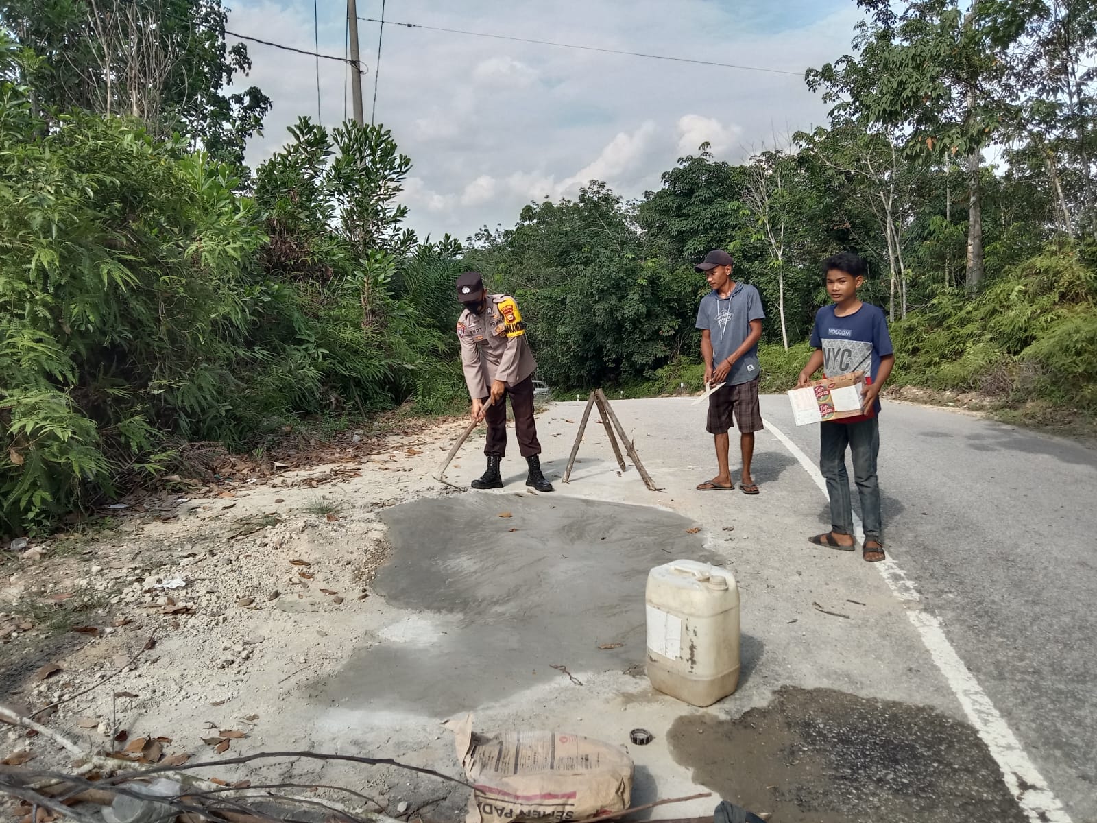 PELALAWAN, NEWSHANTER.COM-Â Bhabinkamtibmas Desa Balam Merah dan Bagan Laguh, Brigadir Rudiansyah SH, mengajak warga untuk memperbaiki jalan berlubang di Jalan Lintas Bono, tepatnya di Desa Bagan Laguh, Kecamatan Bunut, Kabupaten Pelalawan, Selasa (30/1/2024).