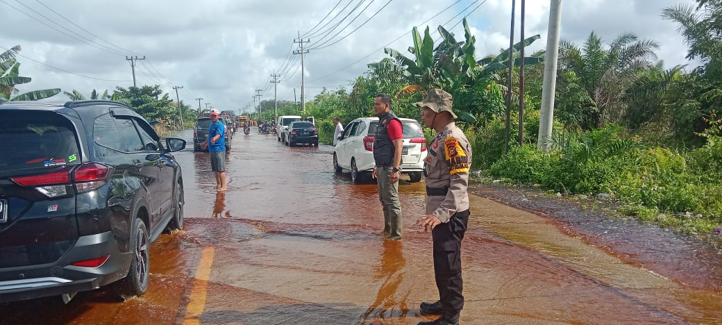 PELALAWAN, NEWSHANTER.COM – Personel Polsek Pangkalan Lesung melakukan pengaturan lalu lintas di lokasi banjir, Jalan Lintas Timur. Tepatnya di Desa Kemang Kecamatan Pangkalan Kuras, Kabupaten Pelalawan Riau, Selasa (2/1/2024).