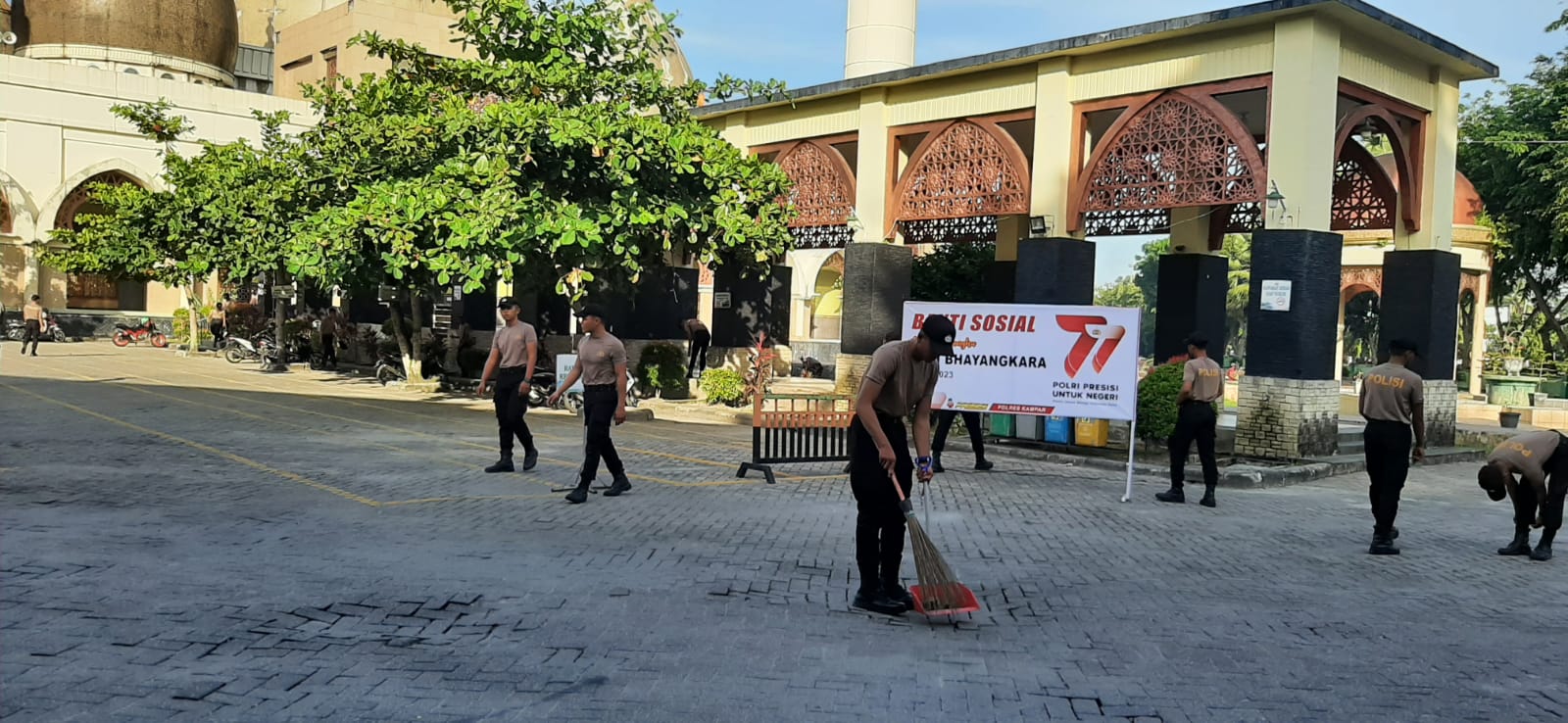 Tim Bakti Sosial Polres Kampar pembersihan di lingkungan masjid dengan menyapu bagian halaman mesjid dan membersihkan toilet.