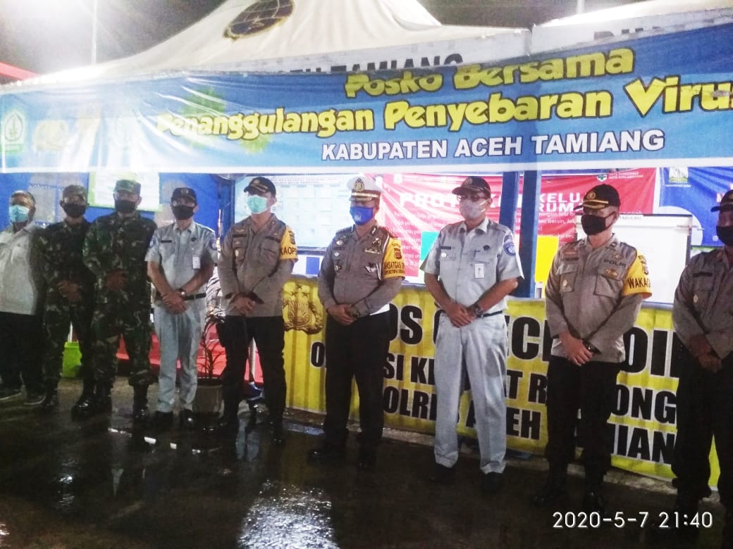 Direktur Lalu Lintas (Dirlantas) Polda Aceh, Kombes Pol Dicky Sondani SIK MH Meninjau kesiapan pelayanan Pos Operasi Ketupat Rencong 2020 dan posko covid-19 di Aceh Tamiang, sekira pukul 21.30 wib, Kamis,(7/5/2020).