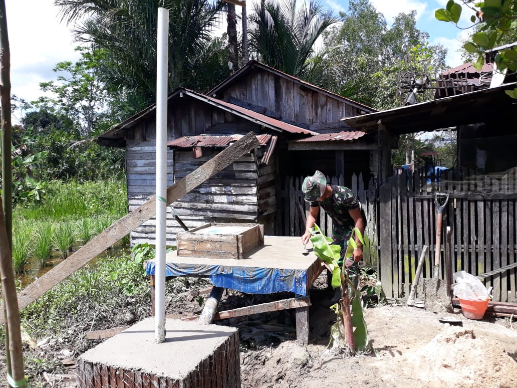 Kapuas,- Prada Andrianto anggota Satgas TMMD Reguler ke-110 Kodim 1011/Kapuas, mengerjakan pembuatan jamban pada rumah warga, di Desa Saka Lagun, Kecamatan Pulau petak, Kabupaten Kapuas Jumat (19/3/2021).
