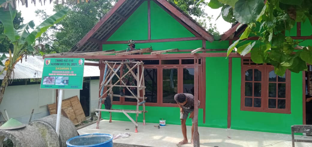 Bojonegoro – Untuk rumah bapak Pasir penerima program Aladin sasaran TNI Manunggal Membangun Desa (TMMD) ke-110 sudah selesai untuk badan rumahnya. Akan tetapi anggota satgas TMMD sedang membuat teras rumah tersebut.