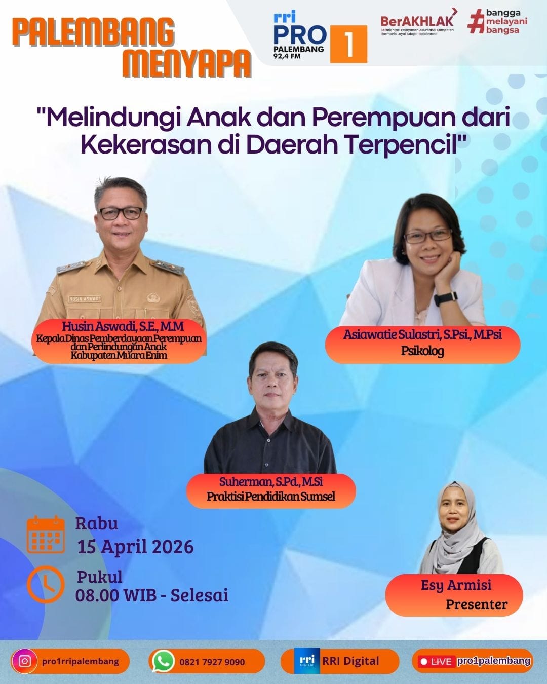 Palembang, mewshanter.com – Upaya perlindungan terhadap anak dan perempuan dari berbagai bentuk kekerasan terus menjadi perhatian serius, terutama di wilayah terpencil yang masih memiliki keterbatasan akses layanan. Hal ini disampaikan oleh Psikolog Asiawati Sulastri, S.Psi., M.Psi dalam program dialog “Palembang Menyapa” yang disiarkan oleh RRI Pro 1 Palembang, Rabu (15/4/2026).