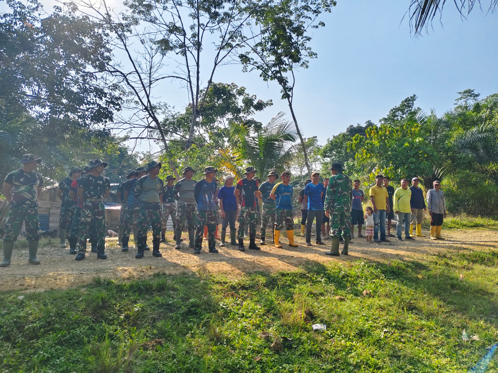 Puluhan personil satgas TMMD Reguler Ke-128 bersama masyarakat melaksanakan rutinitas apel pagi sebelum melaksanakan kembali tugas pengerjaan sasaran fisik pembuatan jalan di Desa Suka Makmur, Kecamatan Sekerak, Kabupaten Aceh Tamiang. Kamis, (23/04/2026).