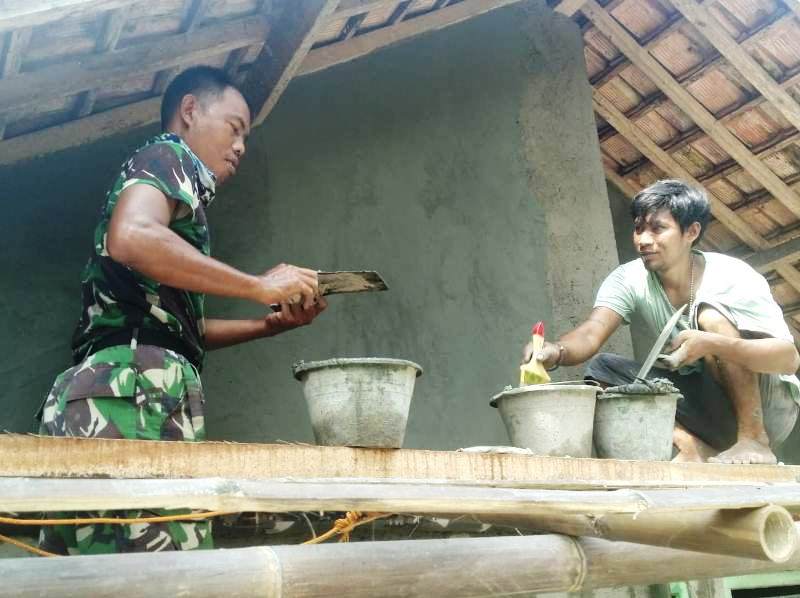 Tampak kesibukan Sertu Fatoni, anggota Satgas TMMD Reguler dari Koramil 07 Wonopringgo, Kodim Pekalongan, bersama rekan Satgas lainnya, membantu tukang bangunan dari masyarakat setempat terus mengerjakan rumah berukuran 5 x 7 meter itu. Sabtu (28/3/2020).
