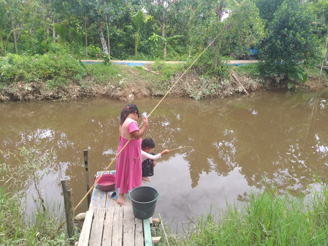 Seperti yang terlihat saat Mila (9), dan Lena (10), mengisi waktu luangnya dengan memancing di jalur sungai desa tersebut. Jika sebelumnya anak-anak ini sering berkunjung untuk bermain bersama anggota Satgas tmmd, namun saat ini sepertinya mereka harus kembali membiasakan diri untuk bisa bermain sendiri lagi pasca kepergian anggota Satgas untuk kembali ke kesatuan masing-masing.