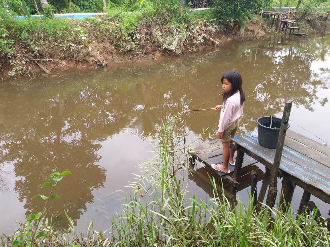 Amira terlihat berdiri di pinggiran sungai dan mengulurkan kayu pancingannya sambil di awasi oleh kakaknya. “Itu anak saya, dia senang kalau ikut saya bekerja, dan untuk mengisi waktu ia bermain pancingan,” ungkap Subhan ayah dari anak tersebut.