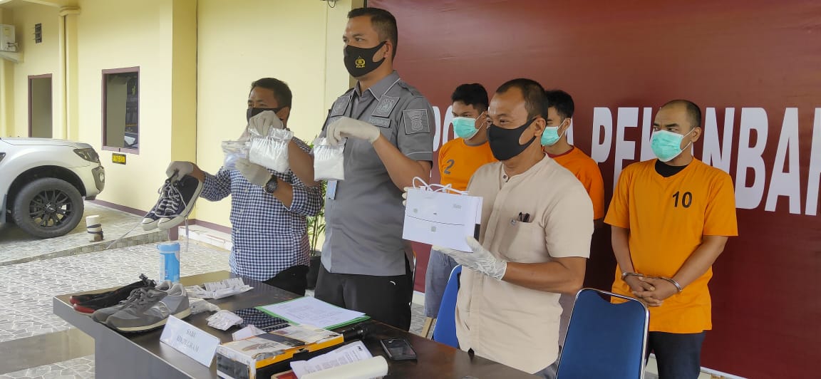 PEKANBARU,newshanter.com – Sat Res Narkoba ekspos pengungkapan penangkapan tiga pelaku jaringan narkotika diduga jenis shabu di ruang lobi Polredta Pekanbaru, Selasa 4/8/2020.