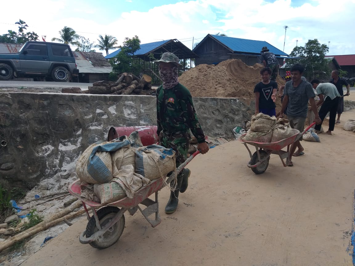 Kapuas,- Satgas TMMD Reguler Ke -110 Kodim 1011/KLK di Desa Saka Lagun, Kecamatan Pulau Petak, Kebupaten Kapuas secara gotong royong melaksanakan kegiatan pembangunan fisik pembuatan jalan usaha tani. Mereka selalu kompak mengumpulkan material pasir hanya dengan menggunakan cangkul dan dibawah menggunakan gerobak dorong, Rabu (24/3/2021) pagi.