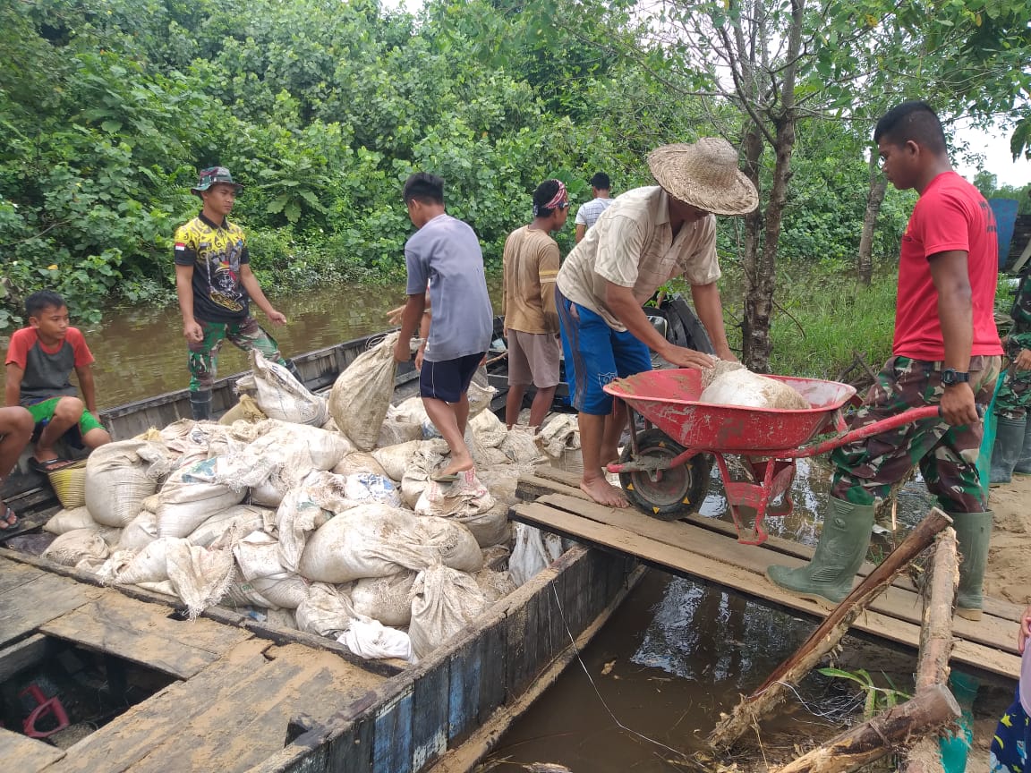 Kapuas,- Secara gotong royong warga dan satgas TMMD ke-110 Kodim 1011/KLK menurunkan pasir dari perahu kayu dan dibawa menuju lokasi pembangunan dengan menggunakan gerobak dorong arco Sabtu (20/3/2021).