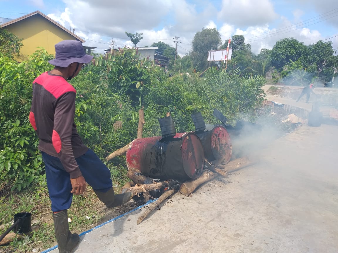 Kapuas,- Untuk lebih memperkuat hasil pembangunan jalan usaha tani (JUT), oleh Satgas TNI Manunggal Membangun Desa (TMMD), Reguler 110, TA. 2021 Desa Saka Lagun, Kecamatan Pulau Petak, Kebupaten Kapuas. Satgas membaluri jalan dengan aspal cair, Minggu (28/3/2021).