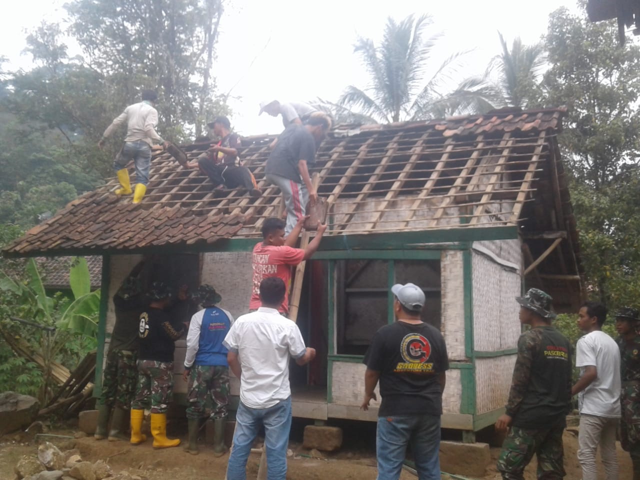 SUBANG, NH- Hari kedua TMMD Ke-108 tahun 2020, anggota Kodim 0605/Subang mulai melakukan pembongkaran rumah Asep Yadi. Rumah tersebut belum mendapat program rehab rumah tidak layak huni (Rutilahu) di Kampung Kiara Koneng II RT 09/03 Dusun III Awi Peuteuy Desa Talagasari Kecamatan Serangpanjang Kabupaten Subang, Rabu (01/07/2020).