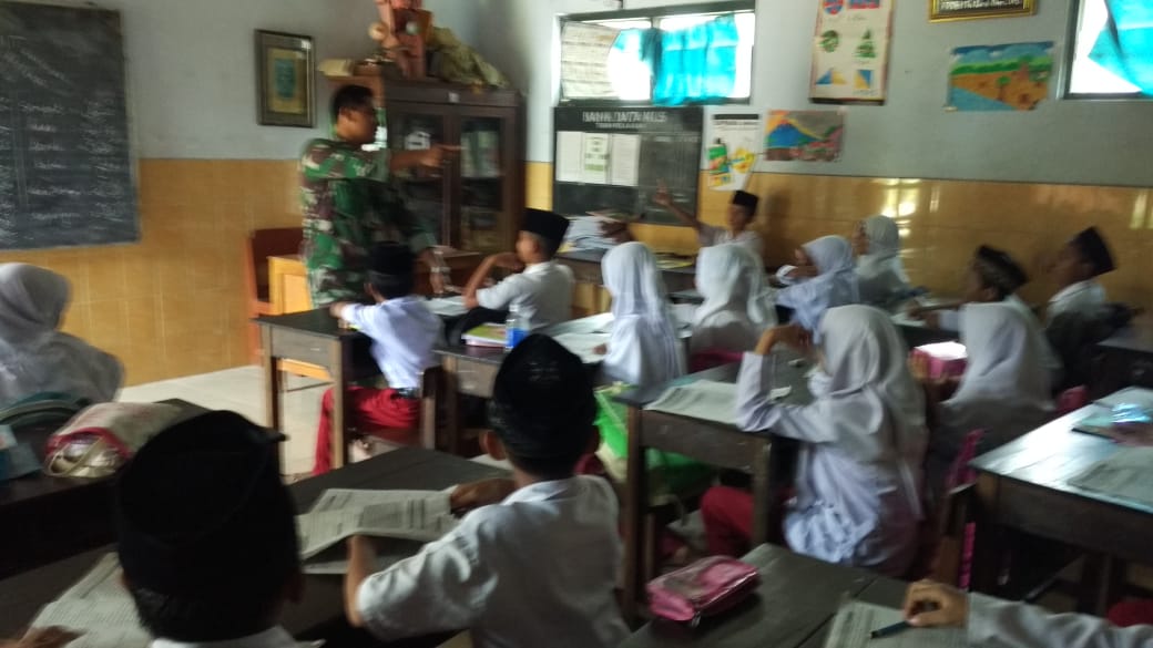 Kudus, NH- Personil Satgas Pra TMMD Reg. Ke- 107 Kodim 0722/ Kudus Sertu Charis tampak sedang mengajarkan tentang Wawasan Kebangsaan Bela Negara di MI Matholibul Ulum II Dukuh batur Rt 07 Rw VIII Desa Kedungsari Kecamatan Gebog ,Kabupaten Kudus, Rabu 11/03/20.
