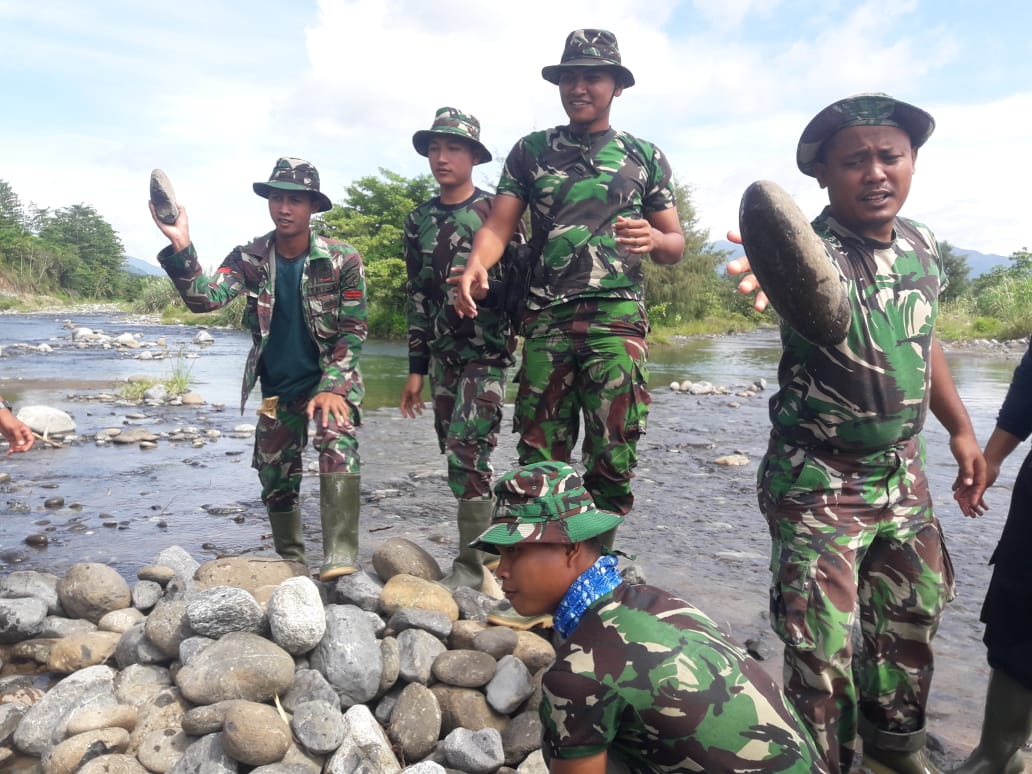 Tepatnya Senin (23/3) anggota TNI yang tergabung dalam Satgas TMMD tahun anggaran 2020 turun langsung melakukan pengumpulan batu di sungai Desa Samalore yang akan digunakan sebagai bahan material pembangunan. Para Anggota TNI bahu membahu melakukan pengumpulan batu. Dengan semangat gotong royong pekerjaan tadinya yang berat menjadi ringan.