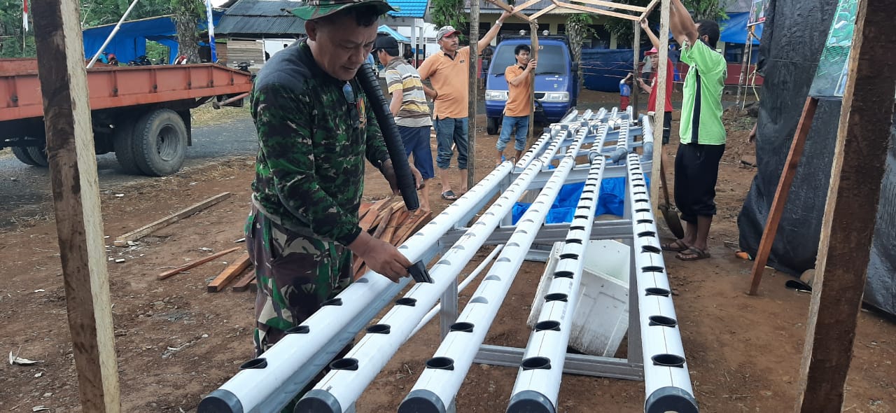 BANGGAI – Penyuluh pertanian Kecamatan Toili dan Kecamatan Moilong gotong royong bersama warga dan Prajurit Satuan Tugas (Satgas) TNI Manunggal Membangun Desa (TMMD) ke 107, mendirikan kebun percontohan budidaya tanaman hidroponik tekhnologi tepat guna.