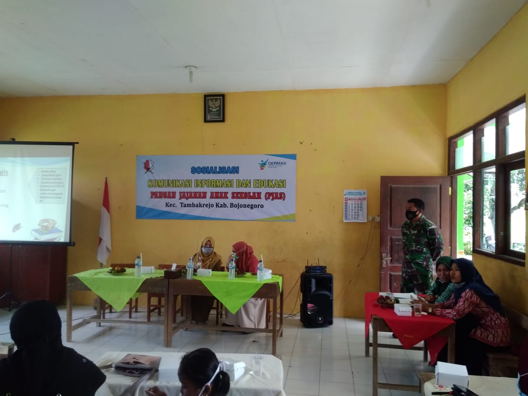 Para anggota satgas TMMD juga melaksanakan pendampingan dalam kegiatan sosialisasi komunikasi informasi dan edukasi PJAS di SD 1 Ngrancang.