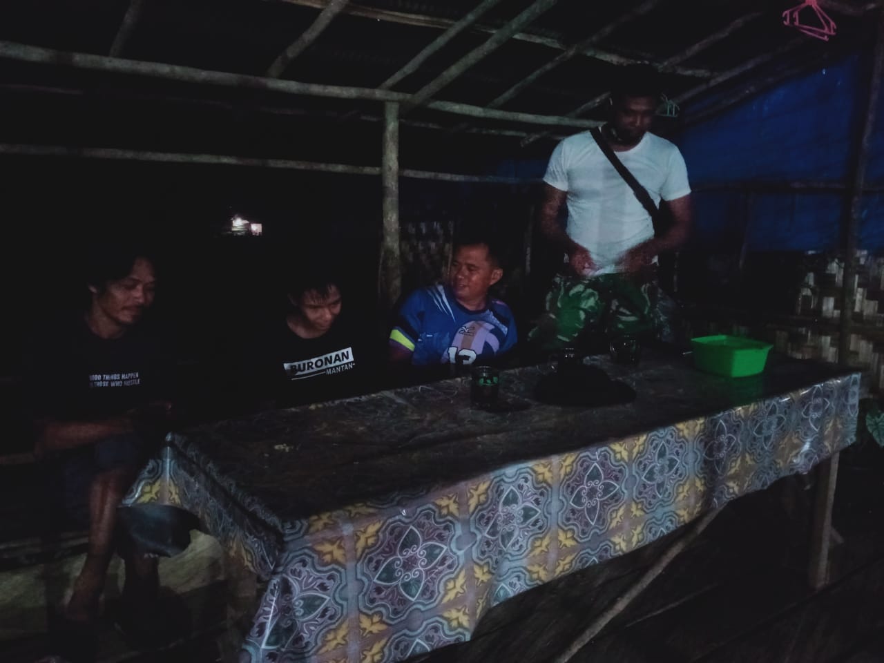 Terlihat malam ini satgas TMMD Kodim 1004/Kotabaru menyempatkan diri untuk ikut bergabung dengan warga yang sedang duduk santai disebuah warung dan menikmati segelas kopi.