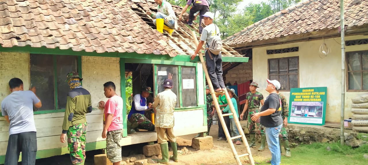Program TNI Manunggal Membangun Desa (TMMD) Ke-108 Tahun 2020 Kodim 0605/Subang, di Kampung Talun RT 13/04 Desa Talagasari Kecamatan Serangpanjang Subang, pembongkaran rumah milik Nemah (63). Prajurit TNI bersama warga masyarakat setempat, bergotong royong, bahu membahu membongkar rumah tidak layak huni, untuk dibangun ulang menjadi rumah layak huni.